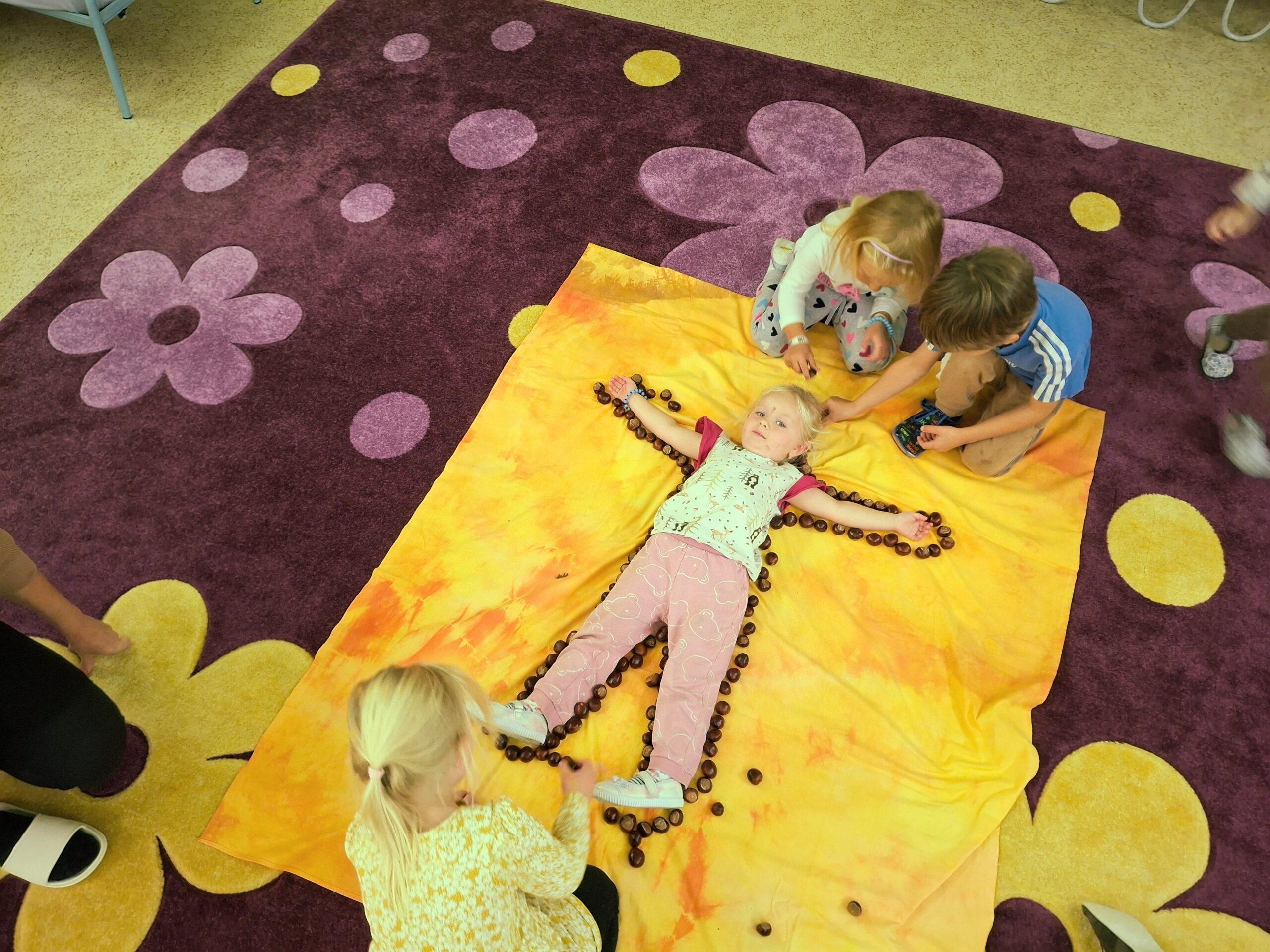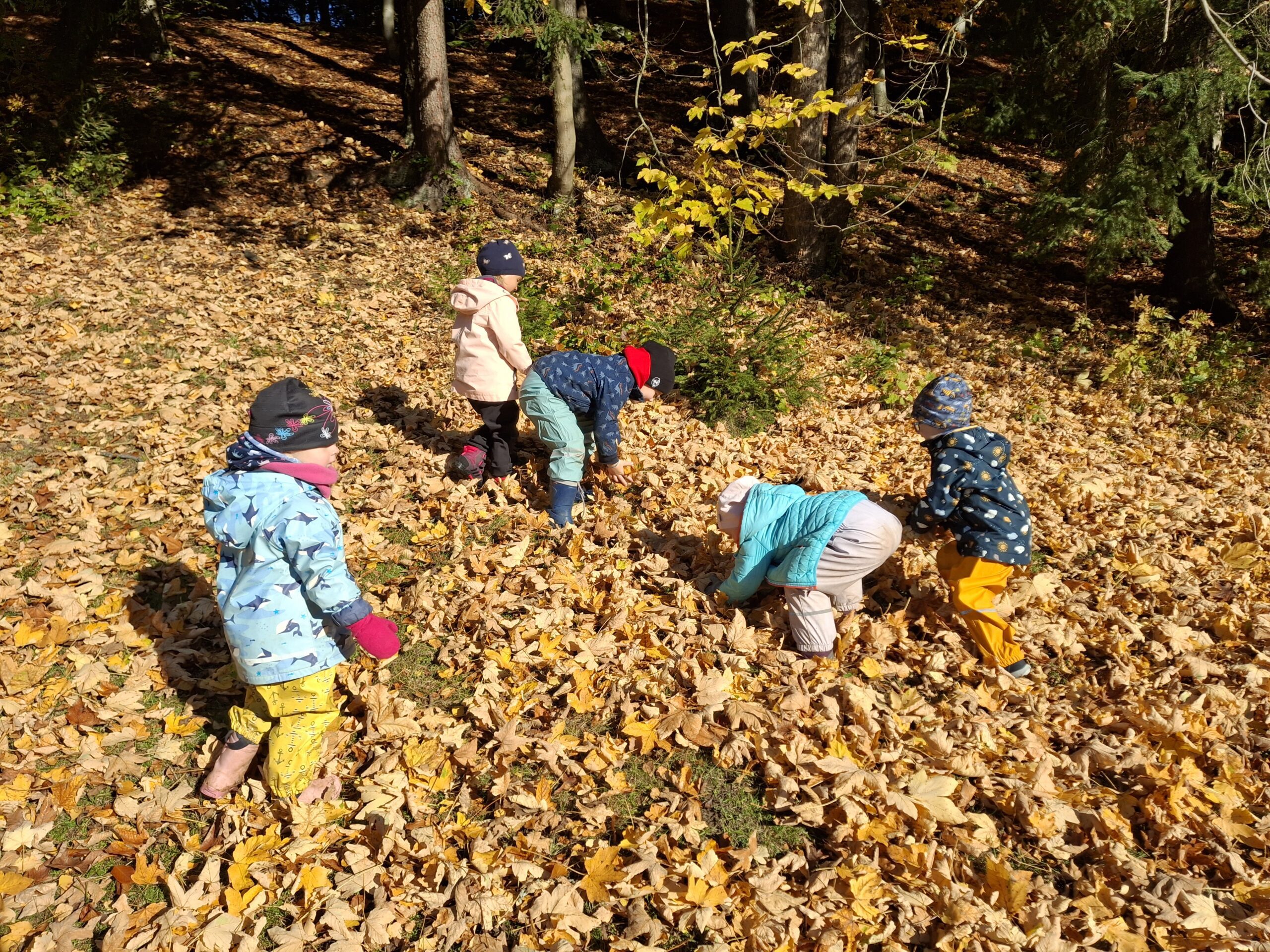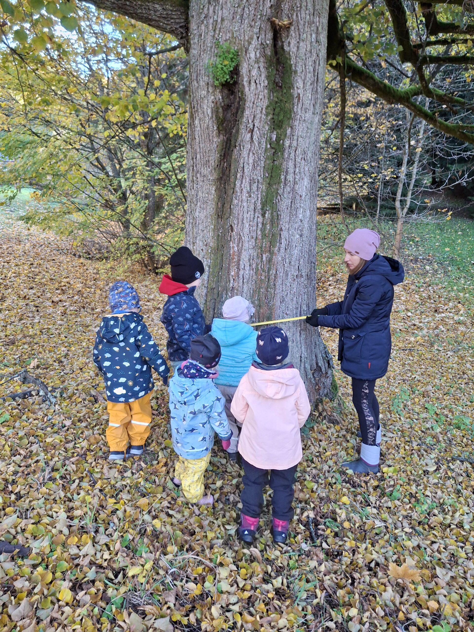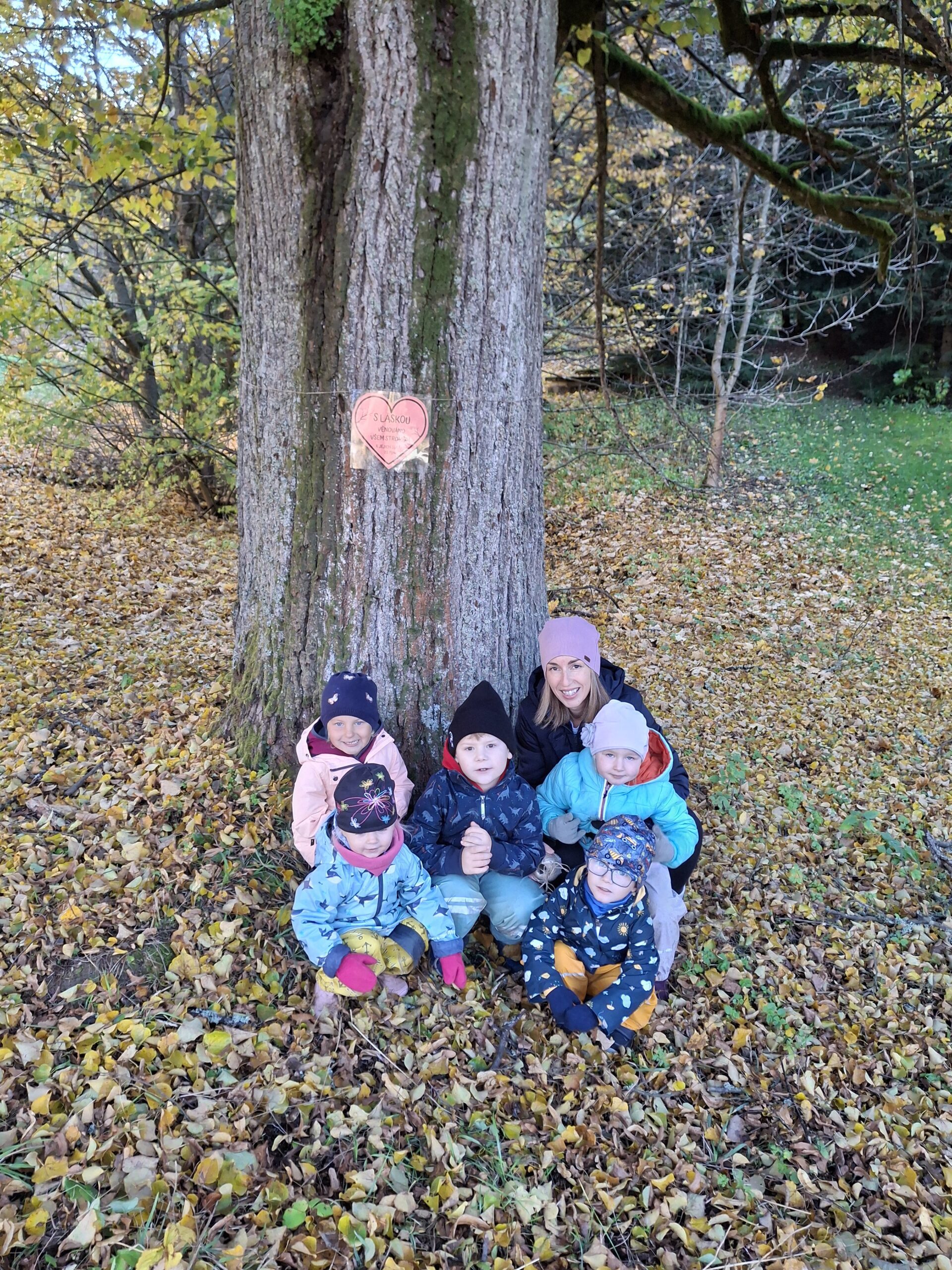 Při procházce jsme změřili starou lípu, která stojí pod školkou a pověsili na ní přání: S láskou všem stromům k jejich svátku. Také jsme si společně zadováděli ve zlatém podzimním listí před školkou.